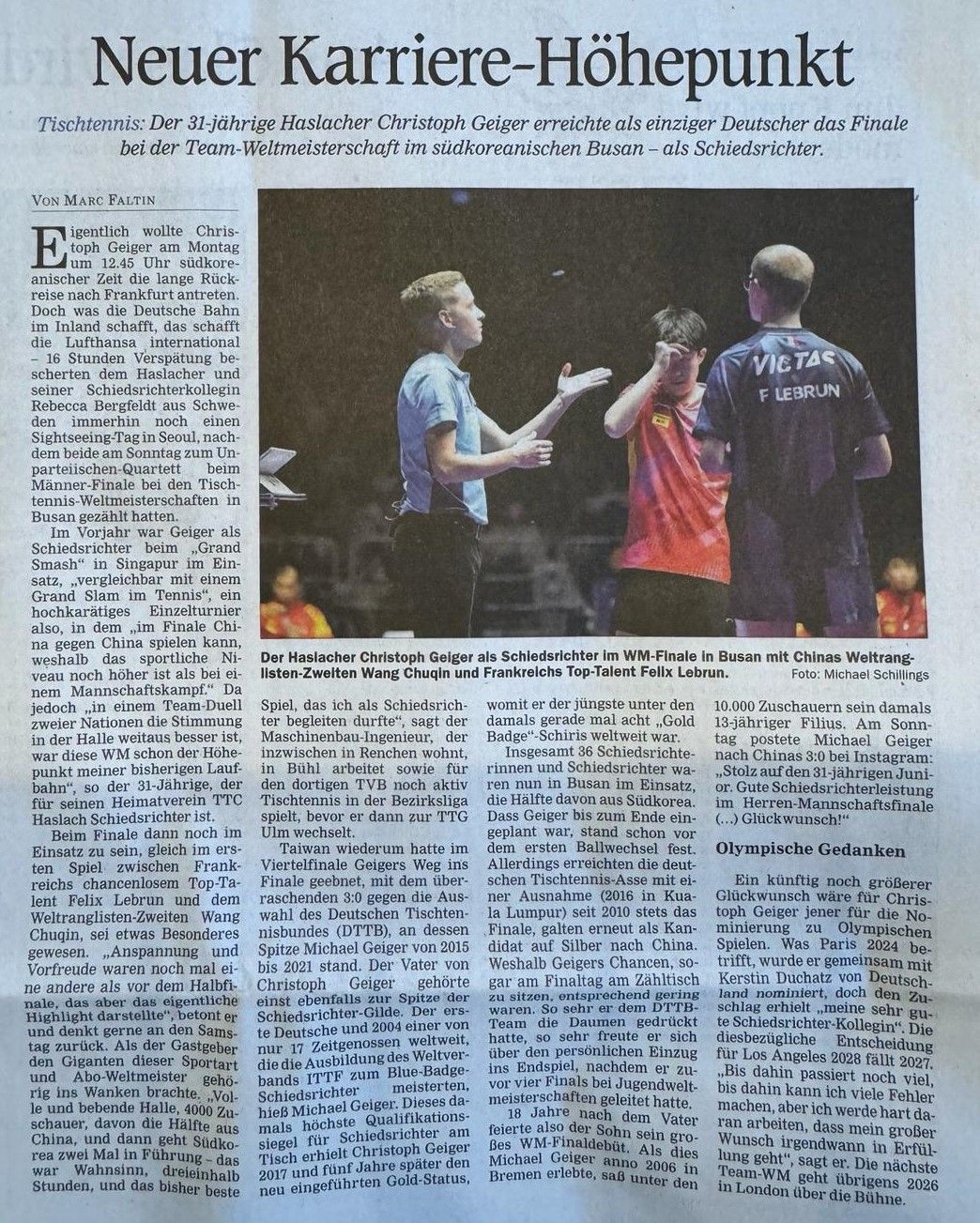 28.03.2024: Auch wenn Christoph Geiger nicht mehr aktiv für den TTC Haslach spielt, so ist er dennoch immer mal wieder in Verbindung mit dem TTCH in der Zeitung genannt. Zuletzt war er im südkoreanischen Busan als Schiedsrichter bei der Team-Weltmeisterschaft aktiv, wo er sogar im Finale vertreten war. Den gesamten Bericht aus dem Offenburger Tageblatt (datiert 28.02.2024) finden Sie direkt im Anschluss.
